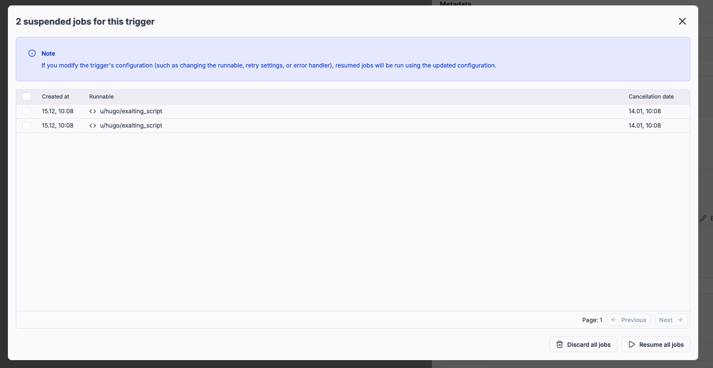 Triggers can now be placed in suspended mode to queue incoming jobs without running them automatically, enabling safer debugging and testing of trigger configurations.